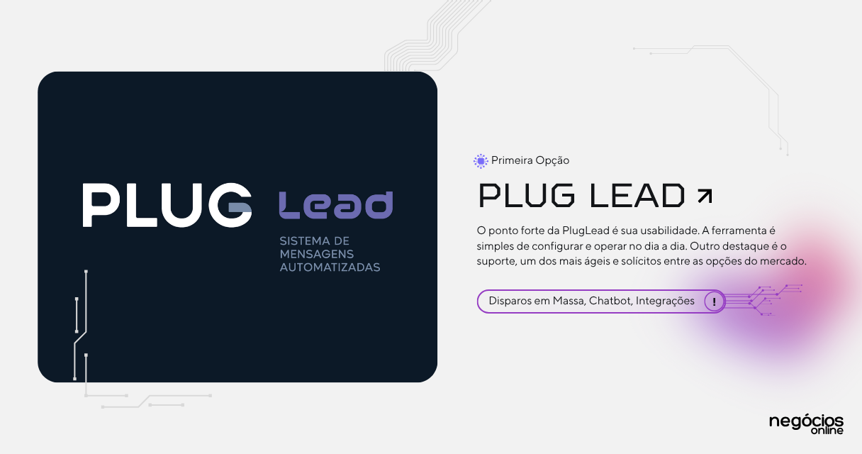 - PlugLead: Ideal para quem está começando, quer simplicidade, suporte fácil e integrações sem precisar entender de programação. Custo mais acessível e recursos completos, como disparos em massa e chatbot arrasta e solta.